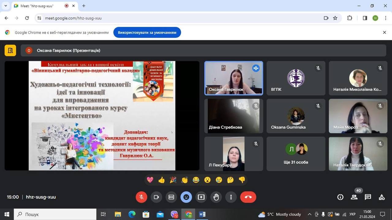 15 березня – 23 квітня 2021 року Всеукраїнське науково-педагогічне підвищення кваліфікації у галузі мистецтвознавства, музикознавства, музичної педагогіки «Музика в системі мистецької освіти: взаємини та протидії» 180 год/ Сертифікат №AOV-152310 від 23.04.2021 р.
