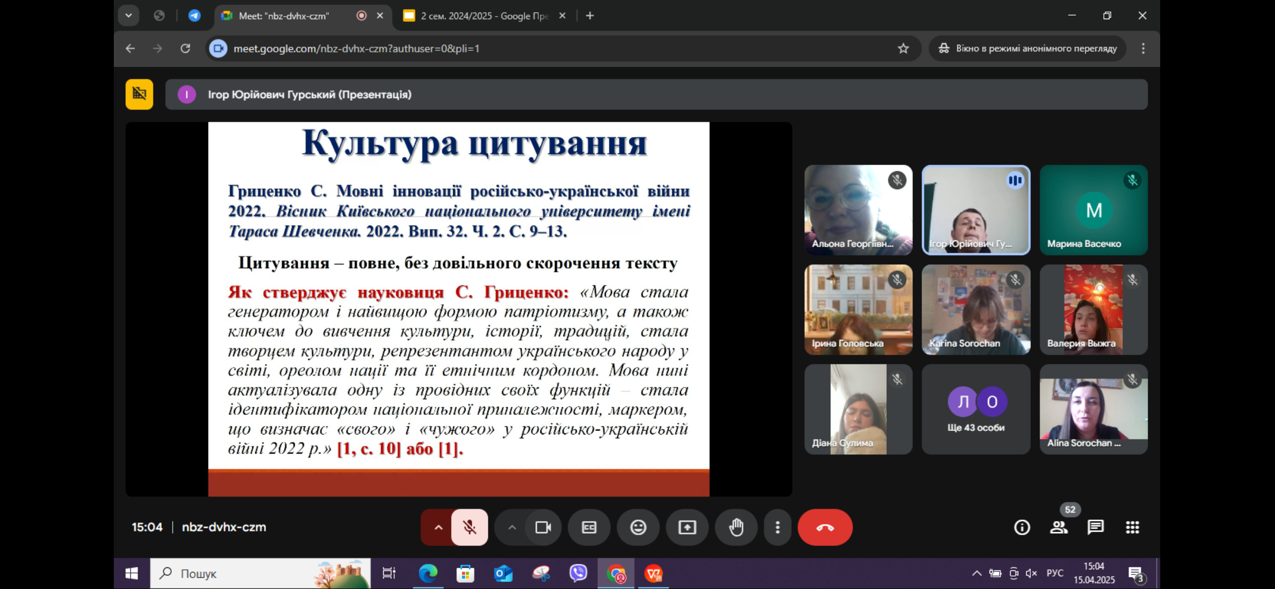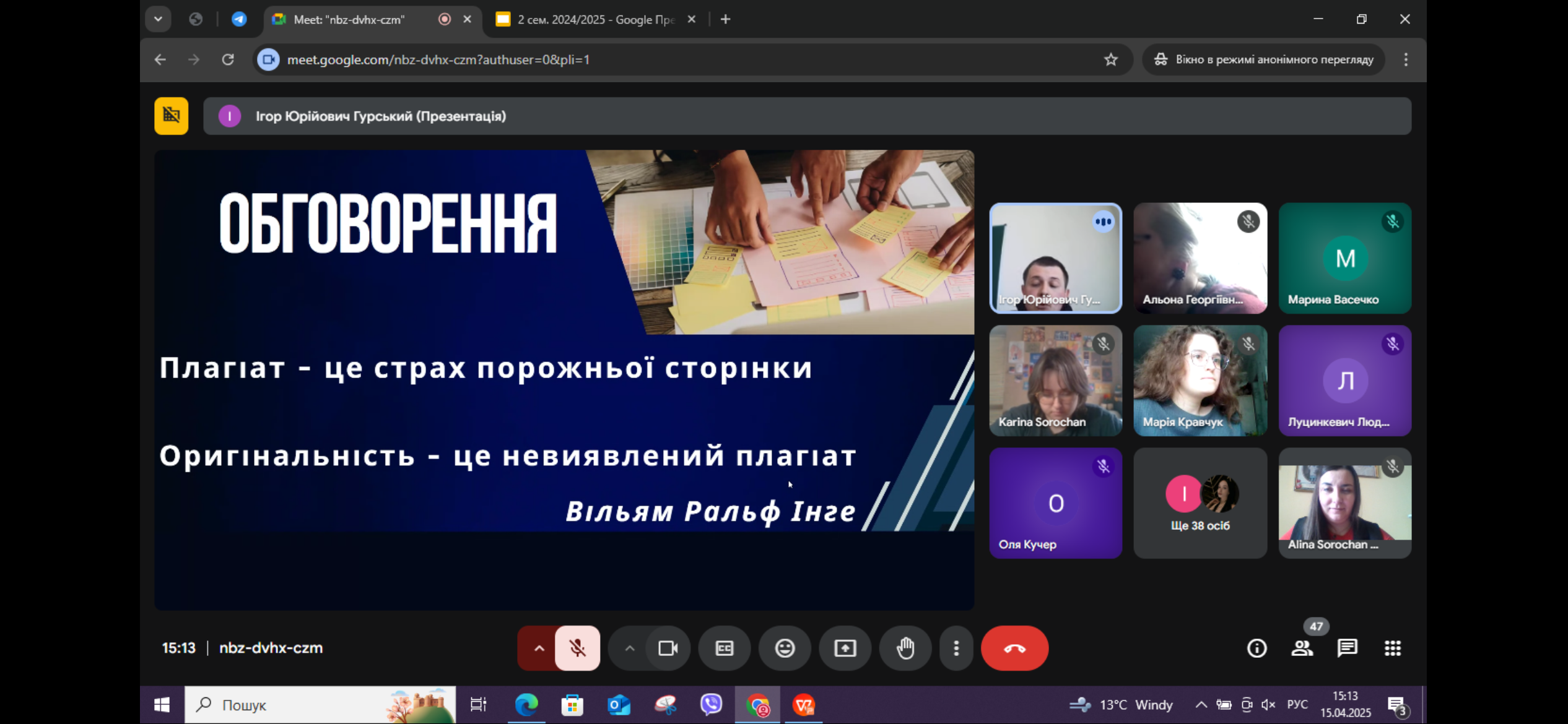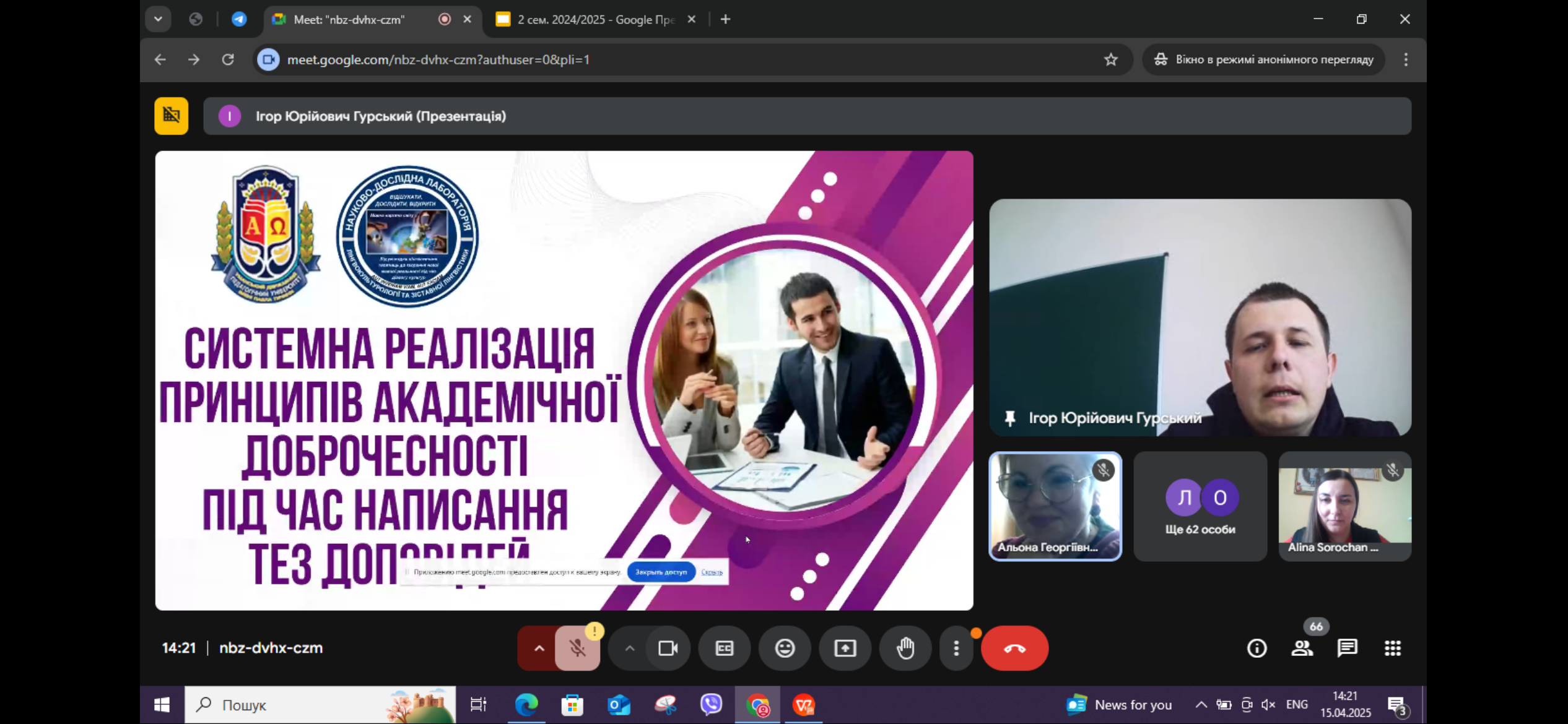 15 квітня для науково-педагогічних працівників і здобувачів освіти КЗВО “Вінницький гуманітарно-педагогічний коледж” було організовано гостьову лекцію онлайн на тему «Системна реалізація принципів академічної доброчесності під час написання тез доповідей»