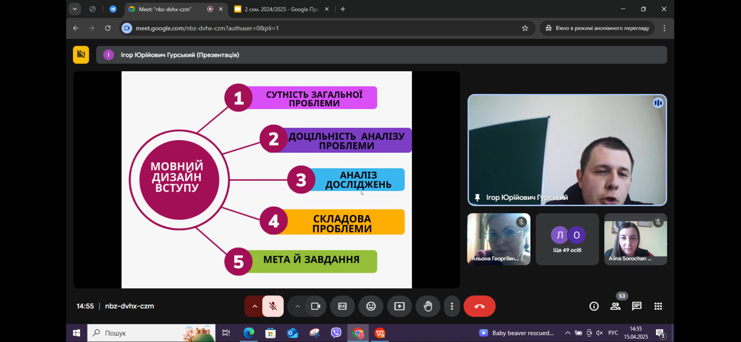 Протягом години лектор навчав майбутніх науковців чітко й правильно розробити «рецепт» написання наукової роботи. Ділився порадами, стратегіями й демонстрував структуру якісного наукового тексту, наводячи яскраві приклади типових помилок, який може припуститися науковець-початківець. Ігор Юрійович запрошував до активного діалогу, пропонував актуальні теми академічно спільноти, зокрема питання використання ШІ з точки зору академічно доброчесності.