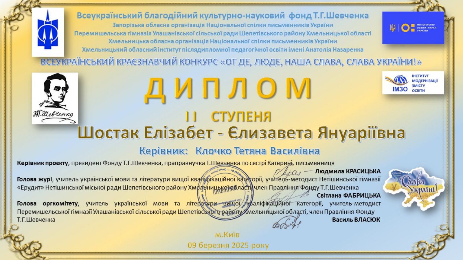 9 березня, у день народження Тараса Григоровича Шевченка, оприлюднено результати ІІ Всеукраїнського краєзнавчого конкурсу ” От де, люде, наша слава, слава України “.