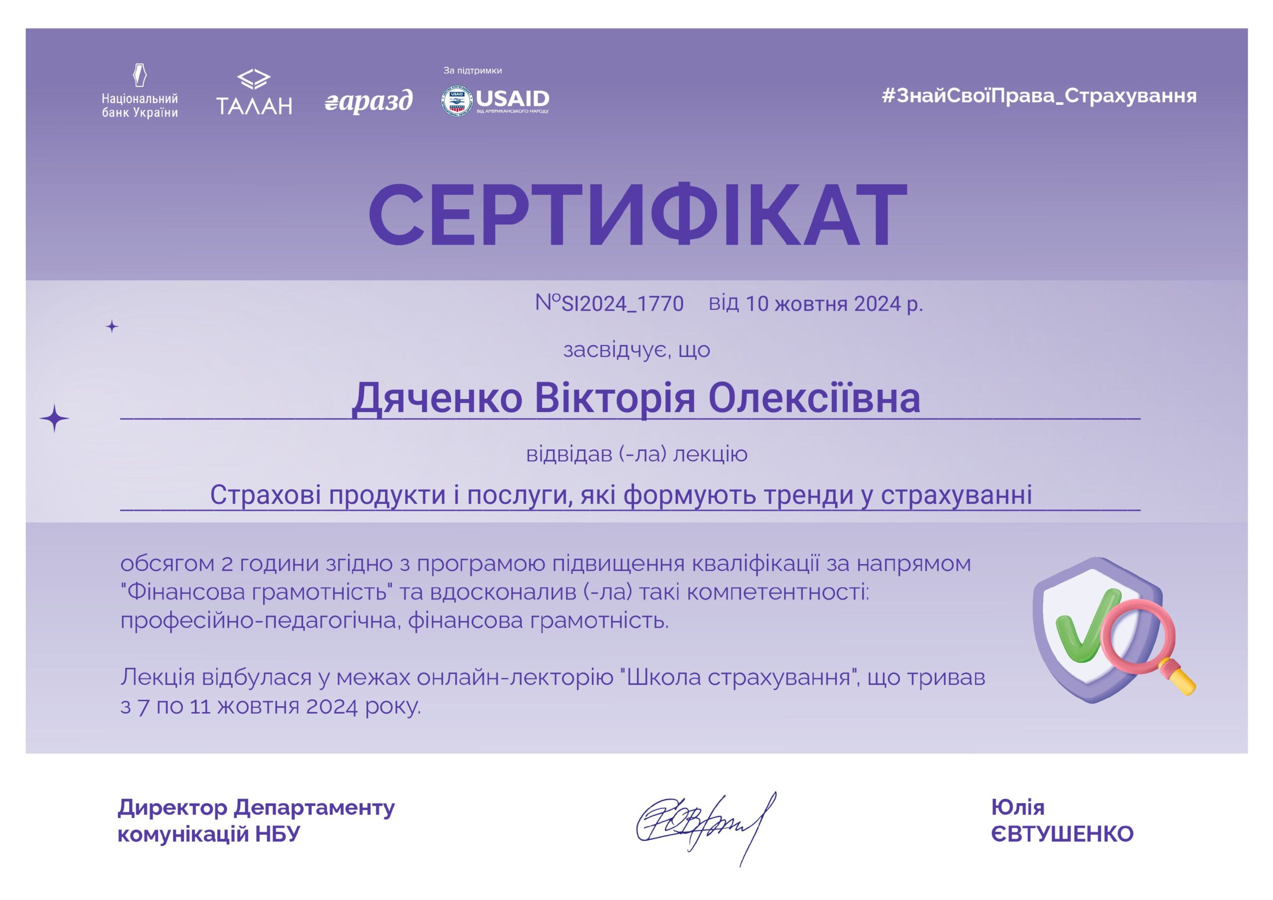 В рамках впровадження неформальної освти здобувачі вищої освіти 11-Фін(б) групи взяли участь в ініційованому Національним банком України онлайн-лекторії “Школа страхування” що тривав з 7 по 11 жовтня 2024 року