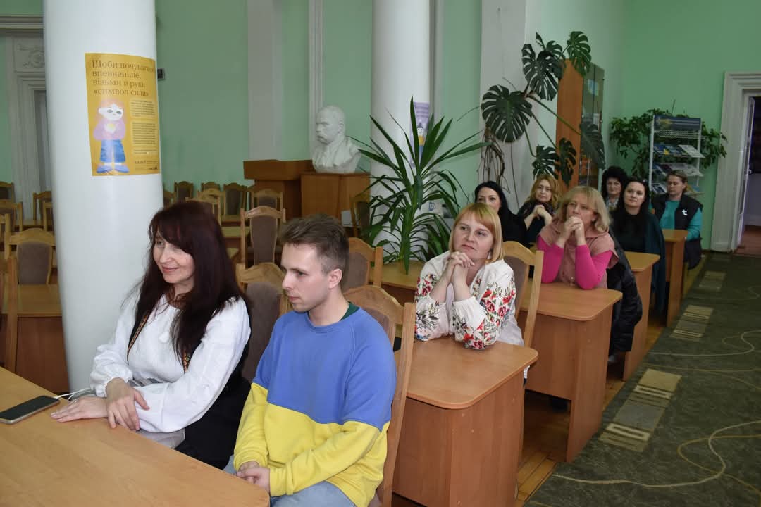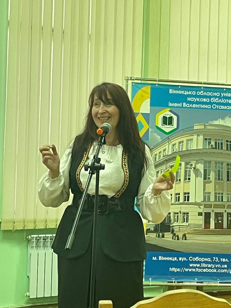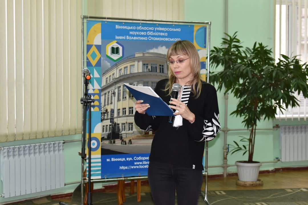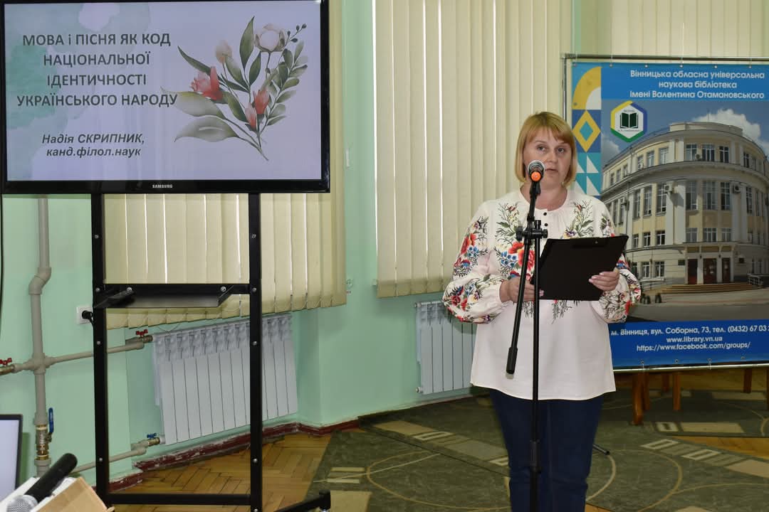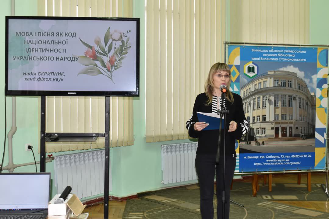25 березня 2025 р. у відділі художньої культури та мистецтв ВОУНБ імені В. Отамановського відбулось засідання розмовного клубу «Українське слово», за темою «Там, де пісня, лине мова. Лине мова – є народ!», де виступила Надія Скрипник, канд.філол.наук, завідувач кафедри української філології КЗВО «Вінницький гуманітарно-педагогічний коледж», з доповіддю “Мова і пісня як код національної ідентичності українського народу”. Слухачі клубу мали можливість в котре переконатися, що без мови ми – ніхто, а маючи свою Мову і свою Пісню, ми – нація Горда і Незалежна. Пісня – це єдність музики і слова. Мова – це велике національне надбання, це пісня душі, це коштовний скарб. Також на заході лунали українські пісні у виконанні Наталії Балинської, викладача музичного мистецтва та Артема Юрченка, здобувача 41-М групи КЗВО «Вінницький гуманітарно-педагогічний коледж».